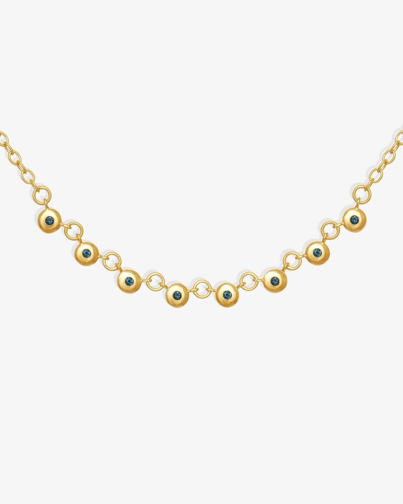 The Mavi Necklace features polished 18k gold vermeil lentil discs, each set with blue topaz in a refined interpretation of the protective evil eye. Linked in sequence along a round link chain, each element moves with the wearer, while the teal gemstones embody the bracelet's Turkish name meaning "blue".