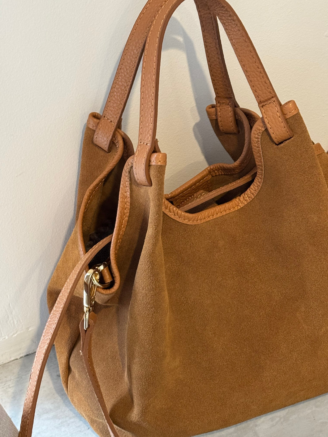 super stylish small suede bag with adjustable strap and small handle ... leather pipping around the edges , magnet presstud closure inside the bag, it can be worn cross body with adjustable strap, matching zip pouch detachable inside the bag , spacious inside for a small bag, gold hardware