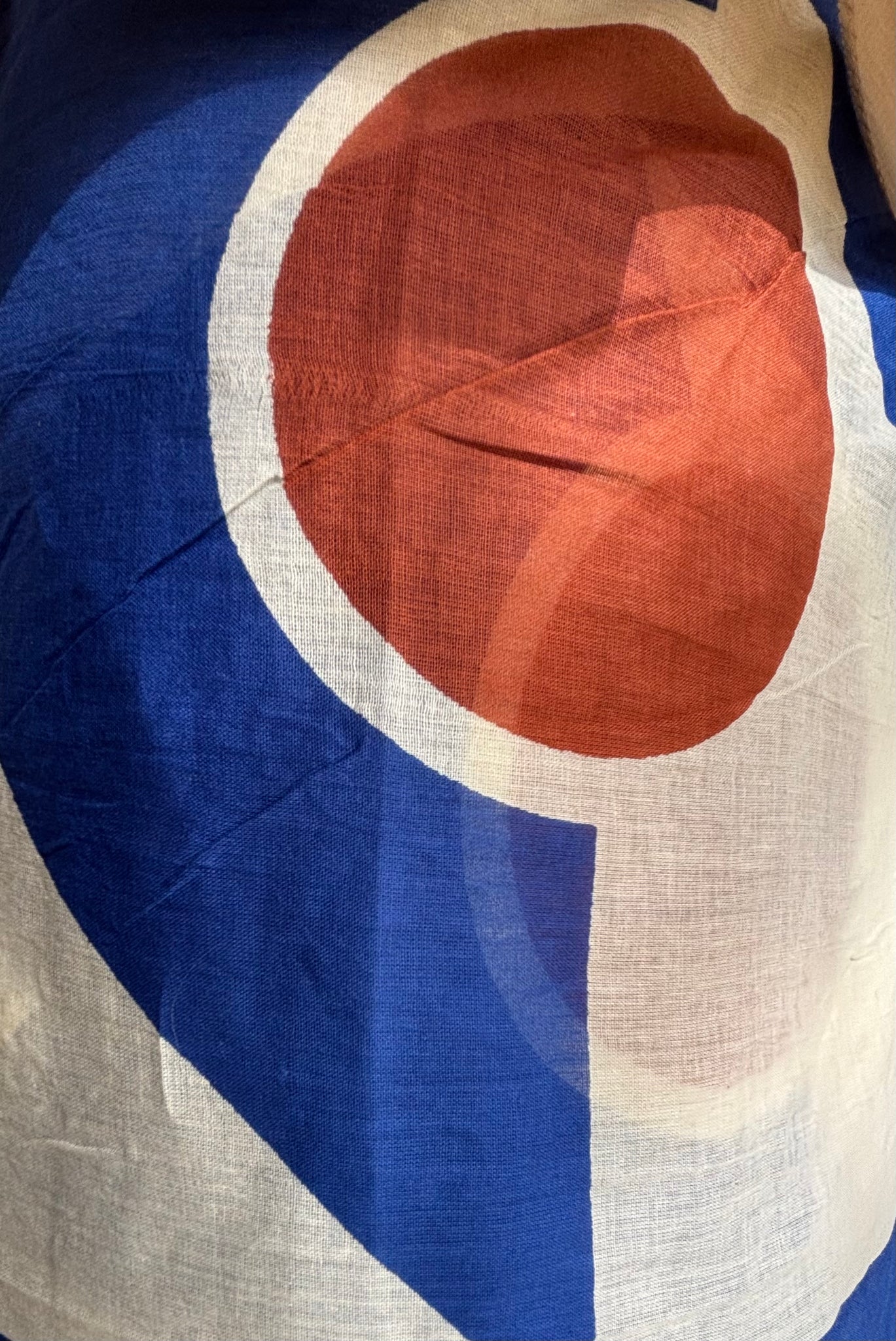 A gorgeous light weight scarf in a generous size for multiple uses - wrap around the waist as a sarong or trendy overlay, or wear around the shoulders or neck for a cover when the sun sets. Blue and rust colours in semi circle pattern with border.